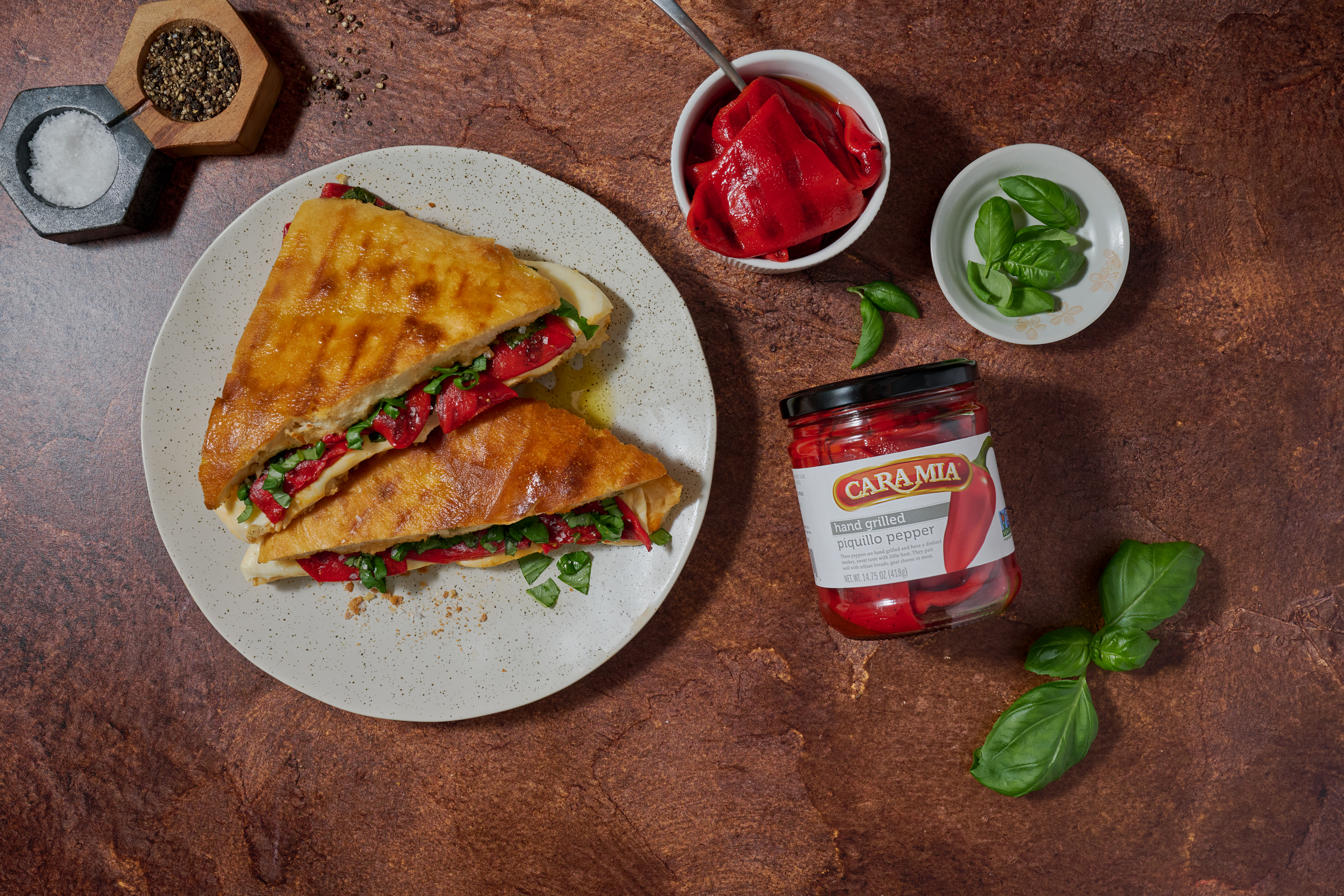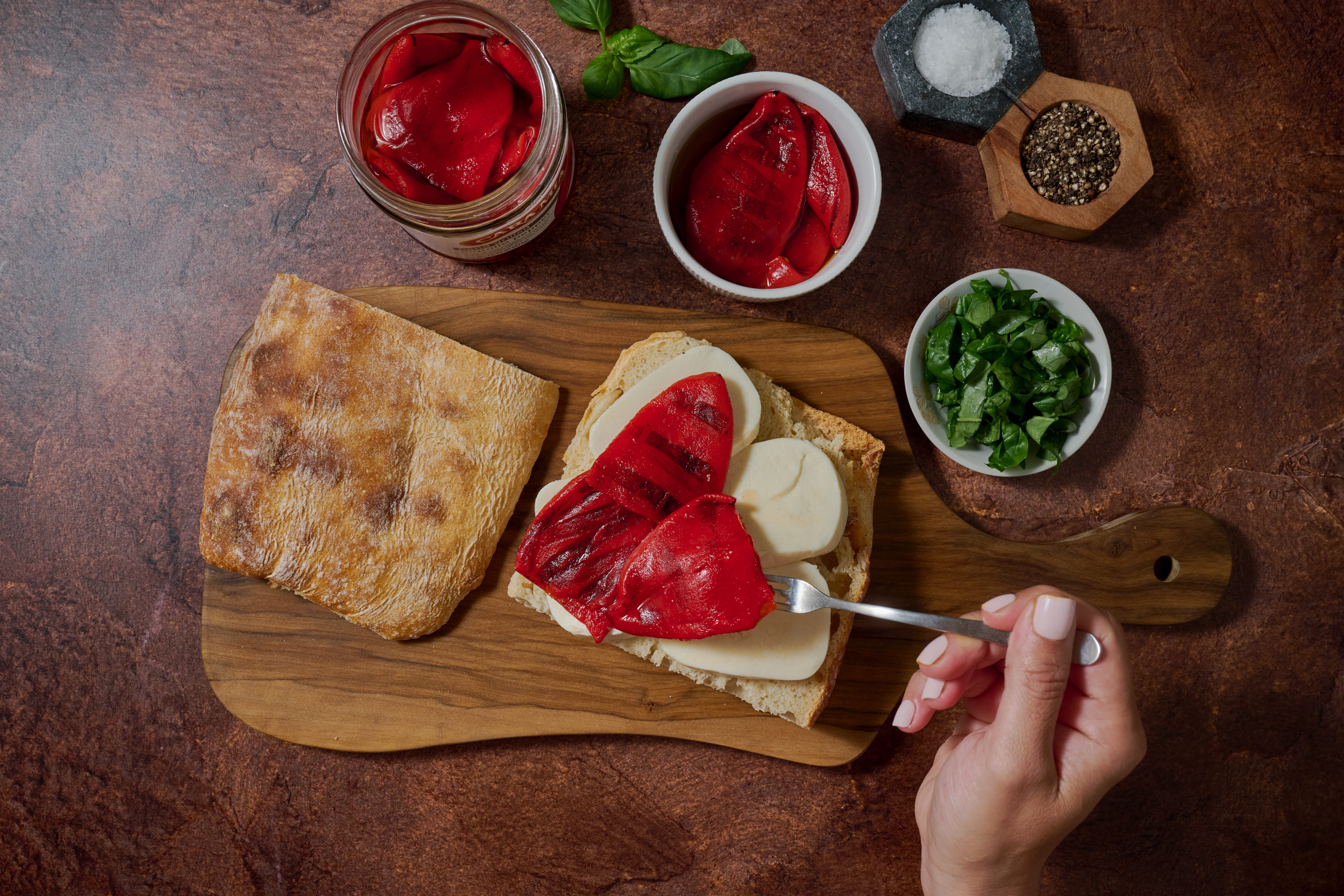 Layer mozzarella, grilled piquillo peppers, and basil on two slices of bread. Add a swipe of pesto or a few arugula leaves if using. Top with the remaining bread slices.