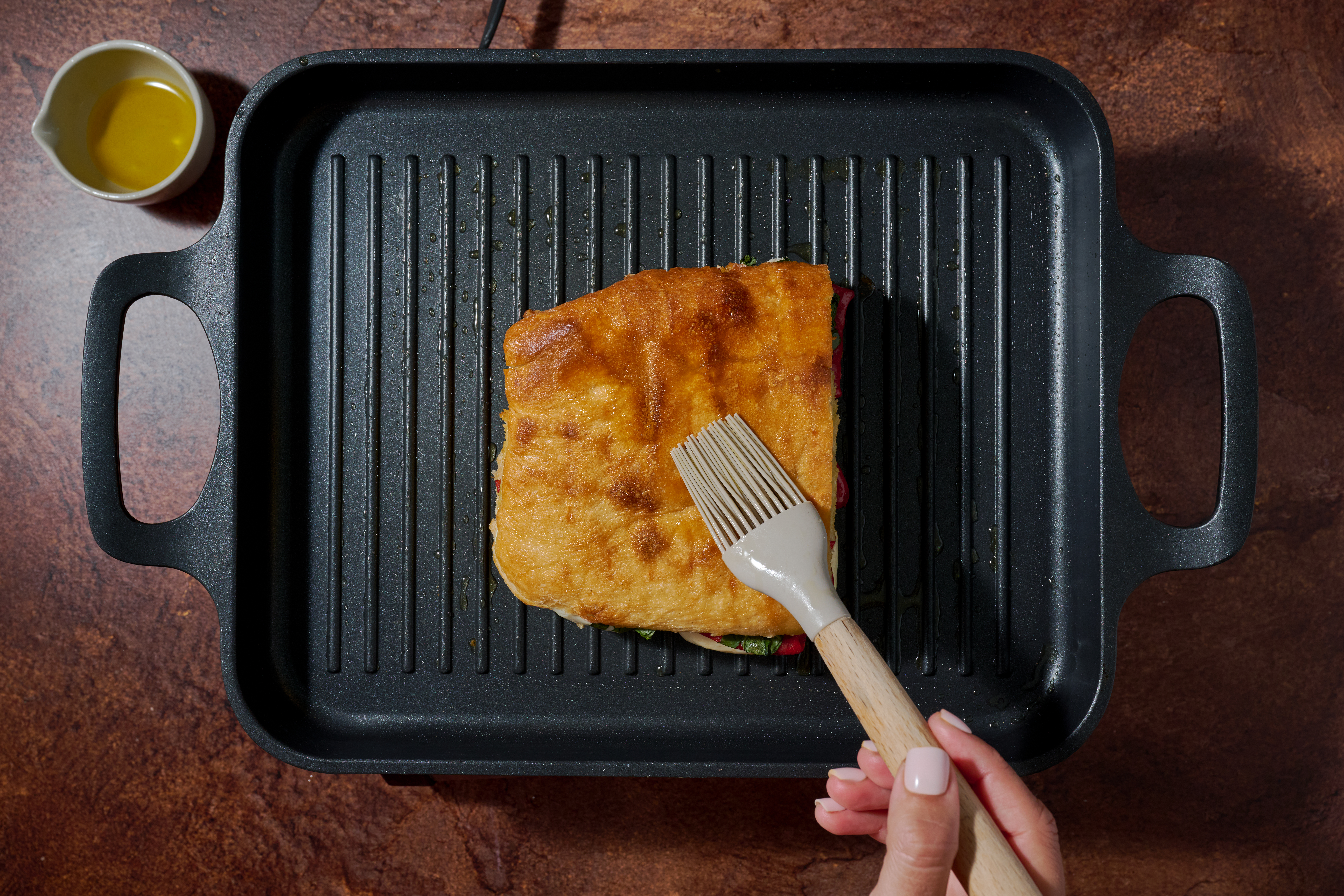 Brush the outside of the bread with olive oil or butter. Place in a panini press or grill pan over medium heat. Press and cook for 3–5 minutes, or until golden brown and the cheese is melted.