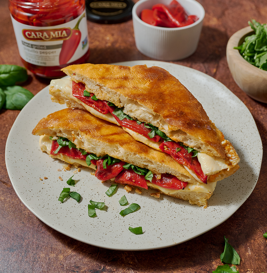 Layer mozzarella, grilled piquillo peppers, and basil on two slices of bread. Add a swipe of pesto or a few arugula leaves if using. Top with the remaining bread slices.