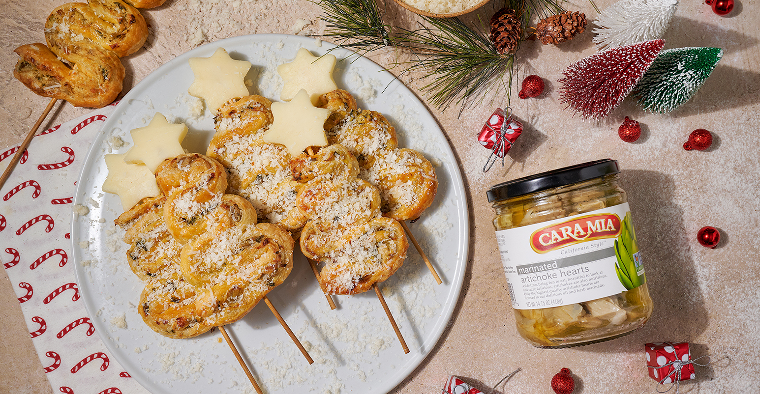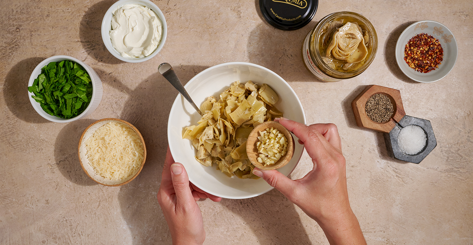 In a small bowl, mix the finely chopped Cara Mia Marinated Artichoke Hearts, spinach, softened cream cheese, grated parmesan, garlic, and crushed red pepper. Season with salt and pepper.