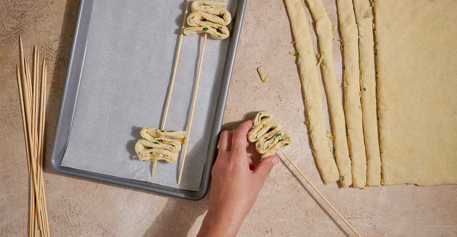 Using a sharp knife or pizza cutter, cut the layered pastry into 1-inch wide strips. Working one strip at a time, thread a wooden skewer from top to bottom while folding the strip back and forth in a zig-zag pattern to create a Christmas tree shape — narrow at the top, wider at the base.